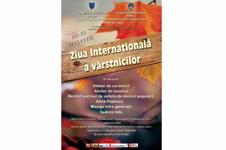 Astăzi, 1 octombrie, începând cu ora 10:00, în Sala Pro Arte a Centrului Judeţean pentru Conservarea şi Promovarea Culturii Tradiţionale Brăila are loc un eveniment cultural dedicat Zilei Internaţionale a Persoanelor Vârstnice. Manifestarea este organizată de Consiliul Judeţean Brăila, Primăria Municipiului Brăila şi Centrul Judeţean pentru Conservarea şi Promovarea Culturii Tradiţionale Brăila cu sprijinul Uniunii Judeţene a Pensionarilor, Consiliului Judeţean al Persoanelor vârstnice şi al Uniunii Judeţene Solidaritatea Pensionarilor Brăila şi constă în: