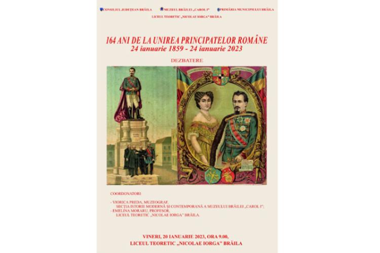 Secția Istorie Modernă și Contemporană a Muzeul Brăilei „Carol I”, cu sprijinul Consiliul Județean și al Primăriei Municipiului Brăila, împreună cu Liceul Teoretic „Nicolae Iorga”, organizează vineri, 20 ianuarie, de la ora 9.00, dezbaterea cu tema „164 de ani de la Unirea Principatelor Române”. Evenimentul are loc în cabinetul de istorie al instituției de învățământ, cu participarea elevilor claselor a VIII-a și a X-a D, de la Liceul Teoretic „Nicolae Iorga” Brăila.