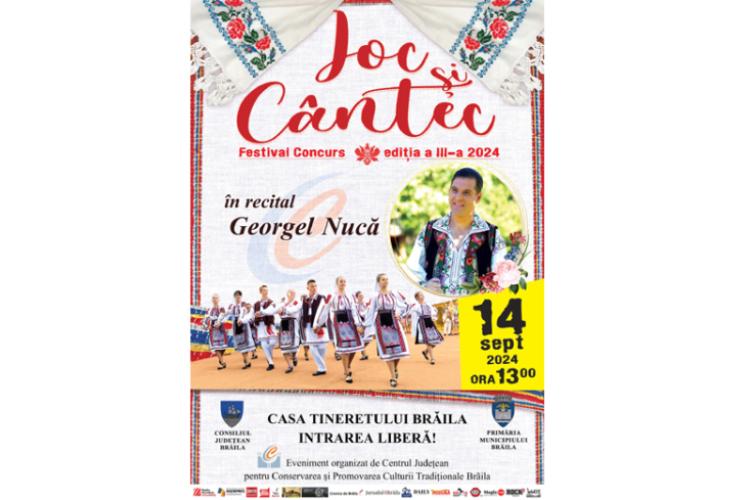 • evenimentul va avea loc pe 14 septembrie, ora 13.00, la Casa Tineretului, iar intrarea este liberă • interpretul Georgel Nucă va susține un recital • vor fi prezente nouă ansambluri din municipiul și județul Brăila (la secțiunea Joc) și 12 interpreți (la secțiunea Cântec), inclusiv Robert Ivan, Andreea Vizureanu și alți adevărați copii-minune ai cântecului tradițional românesc de la Brăila