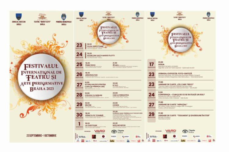 Festivalul Internațional de Teatru și Arte Performative, organizat ca o tradiție de Teatrul “Maria Filotti”, cu sprijinul Primăriei Municipiului Brăila și Consiliului Județean Braila, revine în perioada 23 septembrie – 1octombrie 2023 cu o nouă ediție. În cele nouă zile de festival vă așteaptă un nou regal de artă, emoție și viață, reunite în 21 de spectacole și evenimente (din care două premiere ale dramaticului brăilean). Iar publicul va avea ocazia să vadă spectacole pentru toate gusturile și toate vârstele, producții în premieră, trupe din străinatate, actori renumiți la nivel național și regizori importanți, dar și să participe la lansări de carte și expoziții.