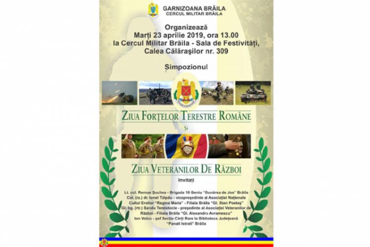 Astăzi, 23 aprilie, de Sfântul Gheorghe, de la ora 13.00, la Sala de Festivităţi a Cercului Militar Brăila, Calea Călăraşilor, nr. 309, are loc Simpozionul Ziua Forţelor Terestre şi Ziua Veteranilor de Război. La eveniment sunt invitaţi lt.col. Remus Şuchea – Brigada 10 Geniu “Dunărea de Jos” Brăila, col (rz) dr. Ionel Tălpău, vicepreşedinte al Asociaţiei Naţionale Cultul Eroilor “Regina Maria” – Filiala Brăila-”Gl. Stan Poetaş”, Gl. bg. (rtr.) Sandu Temistocle, preşedinte al Asociaţiei Veteranilor de Război-Filiala Brăila “Gl. Alexandru Avramescu”, Ion Volcu, şef Secţie Cărţi Rare la Biblioteca Judeţeană “Panait Istrati” Brăila.