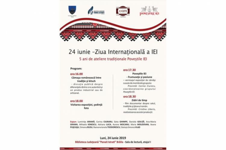 Luni, 24 iunie, începând cu ora 16.00, la Biblioteca Judeţeană “Panait Istrati” va avea loc un eveniment care marchează “Ziua Internaţională a Iei – 5 ani de ateliere tradiţionale Poveştile IEI”. Programul debutează cu o discuţie publică privind “Cămaşa românească între tradiţie şi kitsch” şi continuă cu vernisajul expoziţiei “Poveştile IEI – frumuseţe şi pasiune” în prezentarea Corinei Ciuraru, coordonatoarea grupului Poveştile IEI Brăila-Galaţi. Cei interesaţi sunt invitati să viziteze expoziţia de cămăşi tradiţionale cusute de membrele grupului, exponate care au necesitat luni de muncă şi studiu pentru a reda frumuseţea şi varietatea cămăşilor din diferite zone ale ţării. Expun: Luminiţa Aramă, Corina Ciuraru, Geta Ghimpe, Daniela Goliţă, Ana Maria Grama, Mihaela Ionescu, Adriana Luca, Aurora Mocanu, Maria Moldovan, Ileana Puşcaşu, Simona Rusu, Ramona Ionela Teodorescu, Steluţa Simona Vlad.