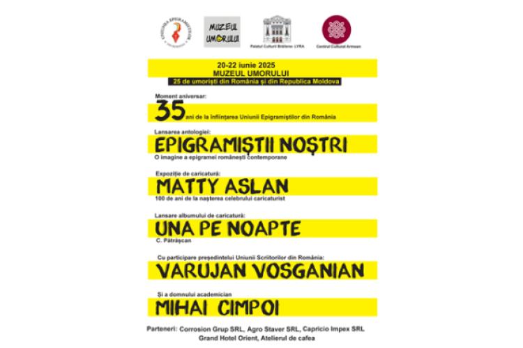 Astfel, sâmbătă, 21 iunie, Muzeul Umorului din Brăila (de la Palatul Culturii Brăilene Lyra) găzduiește un eveniment cultural de excepție, dedicat aniversării a 35 de ani de la înființarea Uniunii Epigramiștilor din România. Evenimentul se va bucura de participarea președintelui Uniunii Scriitorilor din România, Varujan Vosganian, precum și a academicianului Mihai Cimpoi.