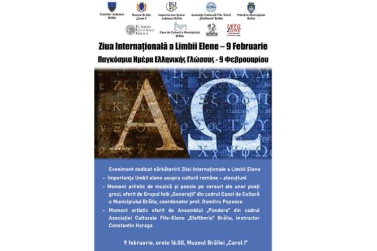 Asociația Culturală Filo-Elenă „Eleftheria” Brăila, în colaborare cu Muzeul Brăilei „Carol I”, Primăria Municipiului Brăila, Consiliul Județean Brăila, Inspectoratul Școlar Județean, Casa de Cultură a Municipiului Brăila, Fundația Culturală Greacă, Editura Omonia și Revista Infozone organizează joi, 9 februarie a.c., de la ora 16.00, un eveniment cultural dedicat Zilei Internaționale a Limbii Elene.