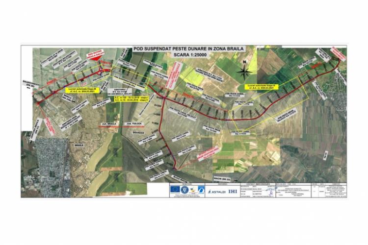 Podul suspendat va fi poziţionat între km 4+596,10 şi km 6+570,52, pe drumul principal Brăila – Jijila, respectiv la km 165+800 pe fluviul Dunărea (kilometraj pe Dunăre, măsurat de la Sulina)”, se mai specifică în comunicatul CNAIR.