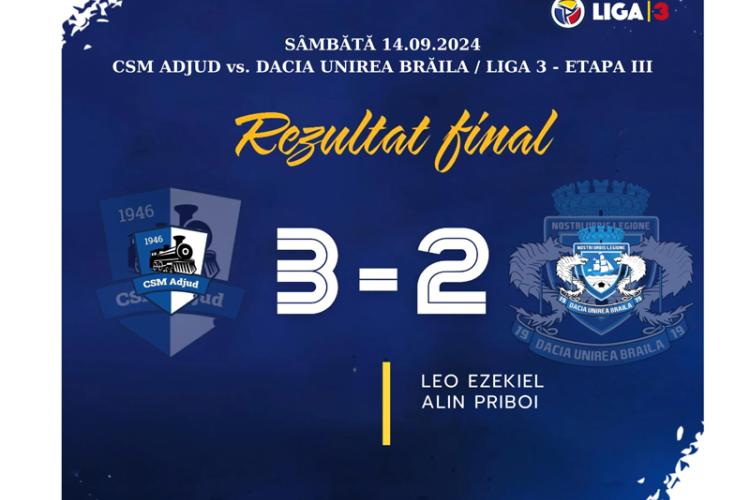 Dacia Unirea a pierdut cu 3-2 la CSM Adjud, aceasta fiind a treia înfrângere consecutivă din turului actualului sezon competițional. Iar dacă în campionatul precedent, după trei runde avea maximum de puncte, acum formația brăileană, cu zero puncte, se află pe ultimul loc al Seriei a II-a din Liga a III-a.