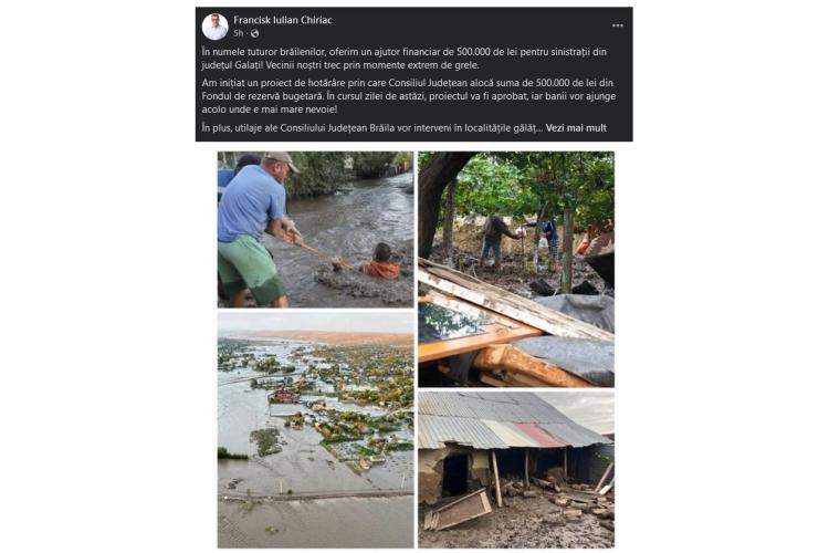 ”În numele tuturor brăilenilor, oferim un ajutor financiar de 500.000 de lei pentru sinistrații din județul Galați! Vecinii noștri trec prin momente extrem de grele. Am inițiat un proiect de hotărâre prin care Consiliul Județean alocă suma de 500.000 de lei din Fondul de rezervă bugetară. În cursul zilei de astăzi (n.r. – joi), proiectul va fi aprobat, iar banii vor ajunge acolo unde e mai mare nevoie! În plus, utilaje ale Consiliului Județean Brăila vor interveni în localitățile gălățene afectate. Sunt mândru de modul în care brăilenii au reacționat și nu cred că există un exemplu mai solid de solidaritate și compasiune!”, a declarat Chiriac.