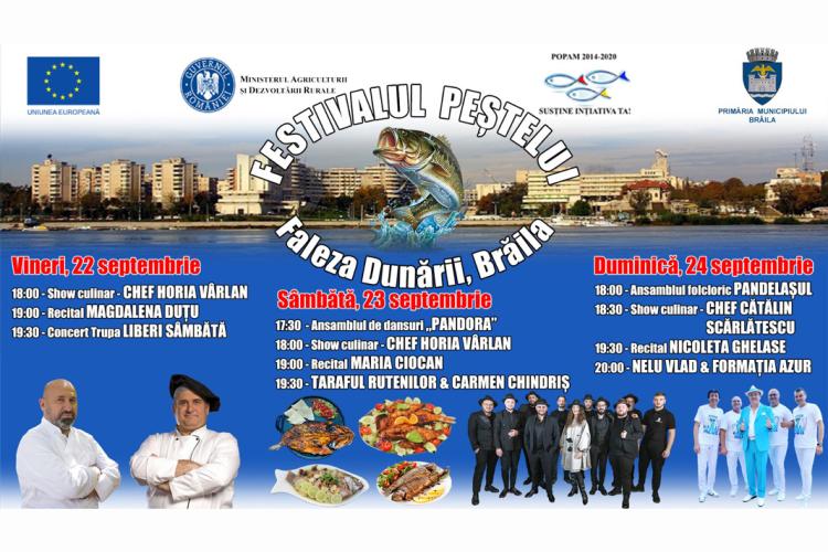 În perioada 22-24 septembrie, pe Faleza Dunării, Primăria Municipiului Brăila organizează Festivalul Peștelui, eveniment ajuns la a cincea ediție. Vor fi trei zile de spectacole, demonstrații culinare, bucate alese și multă voie bună. Iar printre invitații de seamă se numără:
