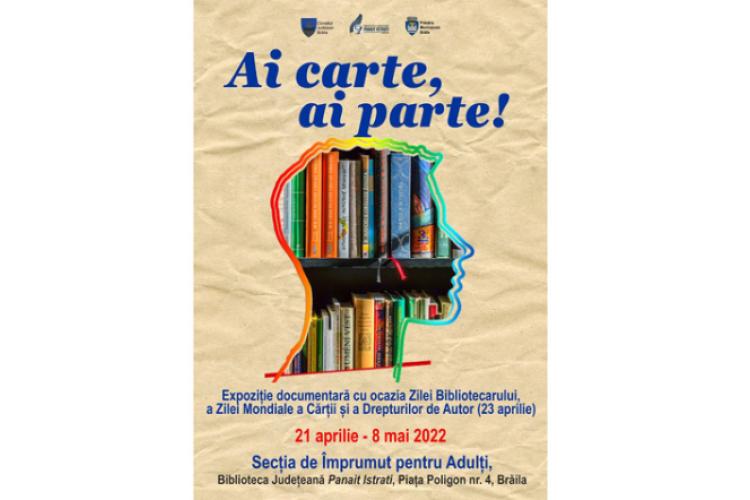 Pentru a marca această zi, Secția Împrumut pentru Adulți a Bibliotecii Județene “Panait Istrati” Brăila organizează, în perioada 21 aprilie – 8 mai 2022, expoziția documentară intitluată “Ai carte, ai parte”, realizată de Silvia Iacob (bibliotecar).
