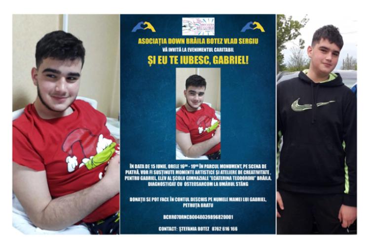 • elev în clasa a VIII-a la Școala Gimnazială „Ecaterina Teodoroiu”, Gabriel practica sport și se bucura de viață ca oricare alt adolescent, când a fost diagnosticat cu o tumoră malignă, în luna februarie • acum, se află înternat la Spitalul Clinic de Copii „Dr. Victor Gomoiu” București, unde a suferit o intervenție chirurgicală de extragere a unei părți din osul afectat • asta după se a urmat mai multe ședințe de chimioterapie la Institutul Oncologic „Profesor doctor Alexandru Trestioreanu” • „Suntem alături de Gabriel”, ne-a declarat Ștefania Botez, vicepreședintele Asociației Down Brăila Botez Vlad Sergiu • pe 15 iunie, în Parcul Monument, asociația organizează evenimentul caritabil „Și eu te iubesc, Gabriel”, la care vor participa elevi de la mai multe școli și grădinițe din municipiu și județ, cercetașii de la „Nufărul Alb”, precum și elevi de la Școala Populară de Artă „Vespasian Lungu” și Palatul Copiilor