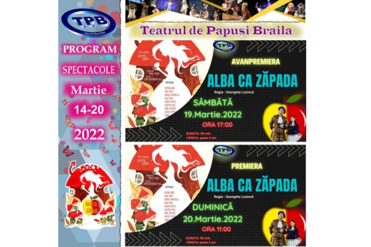 Venind în întâmpinarea copiilor brăileni, Teatrul de Păpuși ”Cărăbuș” Brăila își adaugă în repertoriu un nou spectacol: “Albă ca Zăpada”, ce are avampremiera și premiera în acest weekend. Regia și scenariul aparțin Georgetei Lozincă, scenografia Tünde Tomos și muzica Zeno Apostolache-Kiss. Din distribuție fac parte actorii: Ștefana Niță, Mihai Jinga, Daniela Antonescu, Radu Pavel, Ioana Popescu, Gabriela Picuș, Sofia Cătrună, Aurora Popescu și Iulian Gheorghe.