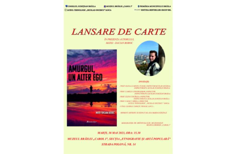 Secția Etnografie și Artă Populară a Muzeului Brăilei „Carol I” găzduiește astăzi, 30 mai, ora 15.30, în superba clădire monument istoric din Strada Polonă nr. 14, lansarea cărții „Amurgul, un alter ego”, de Matei-Dacian Boboc. Cartea a apărut anul acesta la Editura Bestseller din Chișinău.
