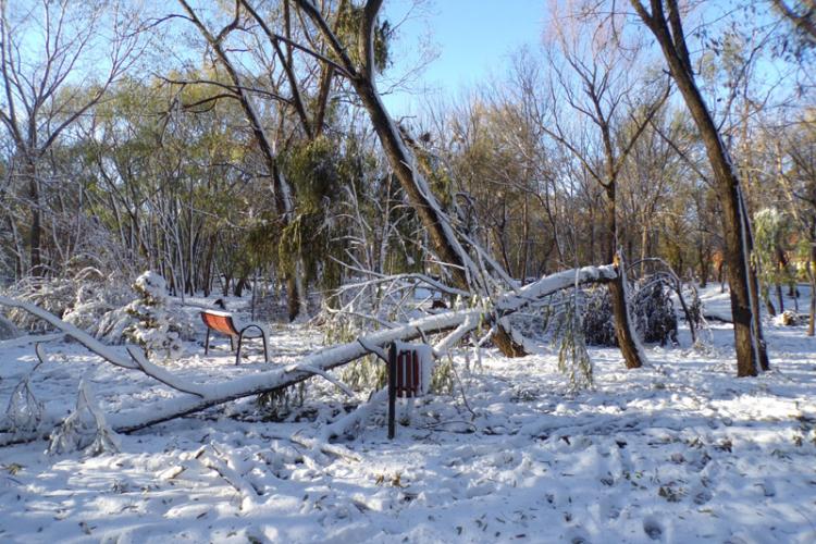 • numărul arborilor doborâți de viscolul de sâmbătă și duminică întrece orice imaginație • Seroplant acționează în teren cu 50 de oameni și numeroase utilaje dar conducerea acestui serviciu din cadrul Primăriei spune că nici până la sfârșitul lunii ianuarie nu vor putea fi înlăturați de pe domeniul public toți copacii căzuți la pământ • în Parcul Monument e un adevărat dezastru