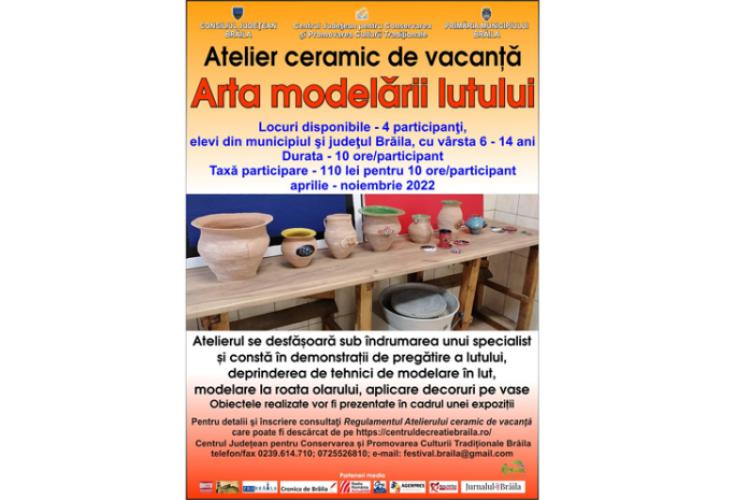 Centrul Județean pentru Conservarea și Promovarea Culturii Tradiționale Brăila (Centrul de Creație) în colaborare cu Primăria Municipiului și Consiliul Județean organizează, în perioada aprilie – noiembrie 2022, Atelierul ceramic de vacanță intitulat „Arta modelării lutului”.