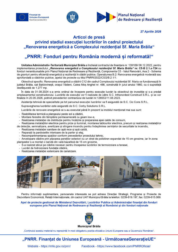 Prima pagină › ANUNȚURI PUBLICE › Articol de presă privind stadiul execuției lucrărilor în cadrul proiectului ”Renovarea energetică a Complexului rezidențial Sf. Maria Brăila” ANUNȚURI PUBLICE Articol de presă privind stadiul execuției lucrărilor în cadrul proiectului ”Renovarea energetică a Complexului rezidențial Sf. Maria Brăila” Publicat în 27/04/2026 • ⏱ 0 minute citire de Obiectiv Vocea Brăilei ETICHETE: ARTICOLE CARE V-AR PUTEA INTERESA Piața auto second-hand: mașini trecute prin multe țări, zeci de proprietari și sute de mii de km dați înapoi S-a hotărât! Nu vor mai exista «păcănele» la Brăila. Vot în unanimitate în Consilul Local Evaluarea Națională la clasa a II-a din 2026 ridică semne de întrebare: dispare redactarea, apar doar exerciții de limbă Cernobîl, locul unde viața sălbatică a învins radiațiile Fără certificat de naștere la reînnoirea carții de identitate! Crima din Port. Condamnarea minorului care a lovit cu cuțitul DE ACELAȘI AUTOR AGENDA EUROPEANĂ | Mihai Tudose: “Planul european pentru combaterea creșterii prețurilor la combustibili nu răspunde crizei imediate” Popa Alexandru, doctorul în combaterea buruienilor și dăunătorilor. De unde? De unde vreți voi! Transformă terasa în sanctuarul tău personal de relaxare De ce devin panourile sandwich soluția numărul 1 pentru casele cu eficiență energetică ridicată în 2026? Brăileanul rănit la domiciliul său, în urma exploziei de la o acumulare de gaze urmate de un incendiu, a fost stabilizat și urmează să fie transfertat la un spital pentru marii arși Lacu Sărat, în cursa pentru „Destinația Anului 2026”. Stațiunea din Brăila mizează pe votul publicului CELE MAI CITITEAstăzi7 zile30 de zileCrima din Port. Condamnarea minorului care a lovit cu cuțitulINFRACȚIUNI / Citit de 1482 oriGALERIE FOTO Globul de granit și continentele greu de văzut de pe Bulevardul IndependențeiADMINISTRAȚIE / Citit de 1172 oriPolițiștii rutieri și echipa canină a Serviciului Criminalistic au acționat în zona unităților școlare din județLOCAL / Citit de 1003 oriAdrian Manole: ”Vreau să fac o treabă bună la acest nivel, așa cum fac la HC Dunărea Brăila”SPORT / Citit de 947 oriAGENDA EUROPEANĂ | Mihai Tudose: “Planul european pentru combaterea creșterii prețurilor la combustibili nu răspunde crizei imediate”POLITIC / Citit de 647 oriUltima oră! Alexandru Popa și-a dat doctoratul ”de mână” cu Cătălin ChivuPOLITIC / Citit de 7920 oriRestaurant amendat cu 120.000 de lei pentru „muncă la negru”ECONOMIC / Citit de 5911 oriUPDATE Explozie de la o acumulare de gaze, în bucătăria unei case de pe strada Ghe. Munteanu Murgoci. Un bărbat de 35 de ani a suferit arsuri grave, fiind internat la Terapie IntensivăLOCAL / Citit de 5763 oriDupă aproape 40 de ani sub drapel, generalul Sorin Călin, comandantul Brigăzii 10 Geniu Brăila, a trecut în rezervăLOCAL / Citit de 5378 oriInstanța a decis: «Sentiment» rămâne după gratiiINFRACȚIUNI / Citit de 4698 oriTragic! A plecat dintre cei vii încă un fost polițist de bază de la Serviciul Investigații Criminale BrăilaLOCAL / Citit de 25564 oriPerformanță de excepție la Spitalul Județean Brăila. Femeia înjunghiată de soțul cu care era în divorț a fost salvată de mediciLOCAL / Citit de 14100 oriBărbat bătut în cartierul Obor. Agresorii au fost reținuți de polițiștiINFRACȚIUNI / Citit de 13005 oriLuptător SAS, pe ultimul drumLOCAL / Citit de 12573 oriO femeie s-a prăbușit pe trecerea de pietoni. Un student la medicină a încercat fără succes să îi acorde primul ajutor. Medicul de pe Ambulanță a declarat decesulLOCAL / Citit de 11104 ori