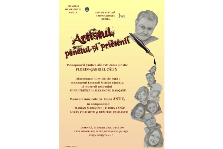 Astfel, potrivit comunicatului trimis de organizatori, Casa de Cultură a Municipiului Brăila îi invită pe brăileni duminică, 17 martie, începând cu ora 17.00, la Casa Memorială „Petre Ştefănescu-Goangă”, din Centrul Istoric al orașului (Piața Poligon nr. 2), la vernisajul Expoziției de desene a artistului plastic Florin-Gabriel Călin. Expoziția, intitulată „Artistul, penelul și prietenii”, include desene în creion ce surprind diverse expresii, fizionomii ale unor personaje (artiști, șefi de instituții, copii etc.) care au ca numitor comun prietenia cu artistul.