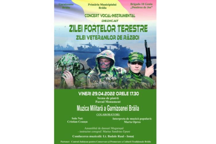 Brigada 10 Geniu „Dunărea de Jos”, Garnizoana Brăila și Primăria Municipiului Brăila, în parteneriat cu Centrul Județean pentru Conservarea și Promovarea Culturii Tradiționale (Centrul de Creație) organizează vineri, 29 aprilie, de la ora 17.30, Concertul vocal-instrumental dedicat Zilei Forțelor Terestre și Zilei Veteranilor de Război.
