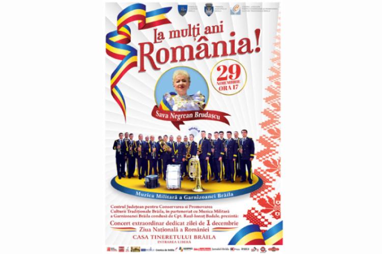 Sub genericul „La mulți ani, România!”, astăzi, de la ora 17.00, are loc, la Casa Tineretului, de pe Calea Călărașilor, Concertul extraordinar dedicat Zilei de 1 Decembrie – Ziua Națională a României – susținut de cunoscuta interpretă de muzică populară Sava Negrean Brudașcu, secondată de Muzica Militară a Garnizoanei Brăila, condusă de căpitan Raul-Ionuț Badale.