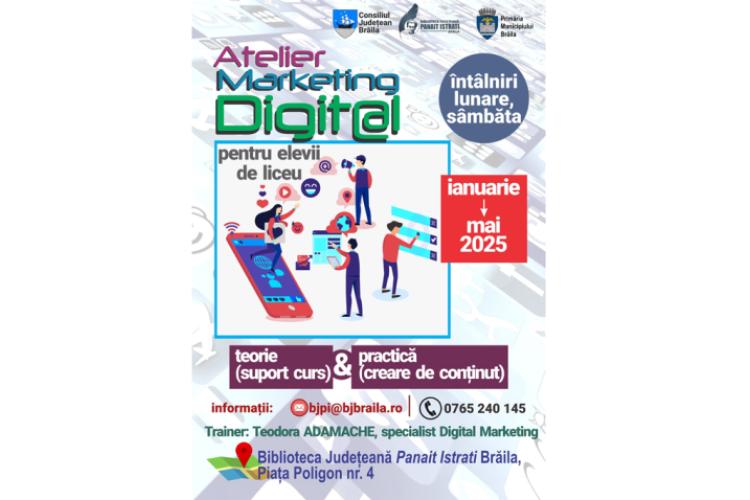 Elevii de liceu care vor să descopere noțiunile și instrumentele de bază ale marketingului online pot participa, în perioada ianuarie – mai 2025, la Atelierul de Marketing Digital susținut de Teodora Adamache, specialist în domeniu, informează surse din cadrul Bibliotecii Județene „Panait Istrati” Brăila. Mai mult, precizează sursa citată, ceea ce se va învăța la cursurile de marketing poate reprezenta un început pentru o viitoare carieră în marketing digital, ecommerce sau publicitate online. Atelierul este gratuit și va avea loc o dată pe lună, sâmbăta, iar numărul de locuri este limitat la 15 participanți. Așa că, pasionații de marketing online ar trebui să se grăbească, pentru a ocupa un loc la atelierul BJPI.