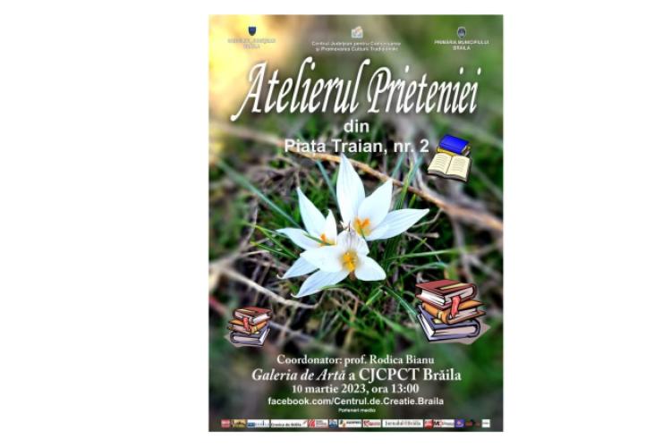 Consiliul Judeţean Brăila – prin Centrul Judeţean pentru Conservarea şi Promovarea Culturii Tradiţionale (Centrul de Creație) – și Primăria Municipiului Brăila organizează, începând de vineri, 10 martie, în incinta Galeriei de Artă, „Atelierul prieteniei din Piața Traian nr.2”, un inedit club de lectură coordonat de doamna profesor Rodica Bianu.