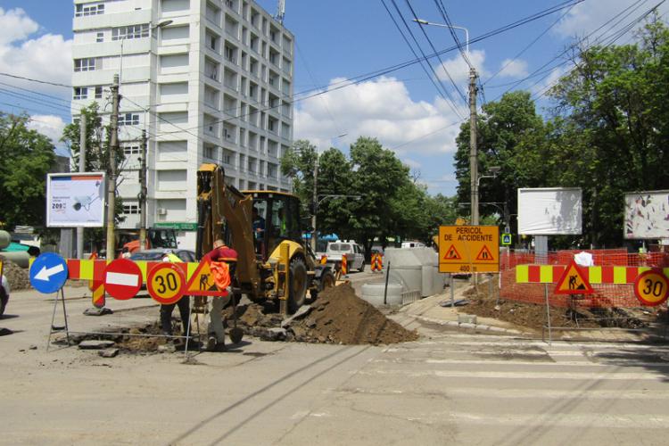 Lucrurile se complică și din cauza blocării trotuarului de utilajele care, printre pietoni, sapă gropi pentru viitorul amplasament al stâlpilor din beton ce vor fi mutați pe ambele sensuri, pentru realizarea de parcări auto. Pe latura dinspre Maternitate sunt tuburi destinate rețelei de apă/canal, în acea zonă pietonii fiind, deocamdată, mai puțin expuși accidentelor.