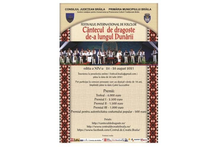 Consiliul Judeţean Brăila şi Centrul Judeţean pentru Conservarea şi Promovarea Culturii Tradiţionale (Centrul de Creaţie) au dat publicităţii Regulamentul celei de-a XIV-a Ediţii a Festivalului Internaţional de Folclor „Cântecul de dragoste de-a lungul Dunării”, care se va desfăşura la Brăila, în perioada 24-26 august 2021.
