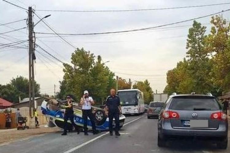 Autospecială a Poliției răsturnată pe carosabil, după ce a fost lovită de o mașină care ieșea dintr-o stație Peco, în comuna Viziru. Polițistul aflat la volan a fost transportat la spital pentru îngrijiri medicale