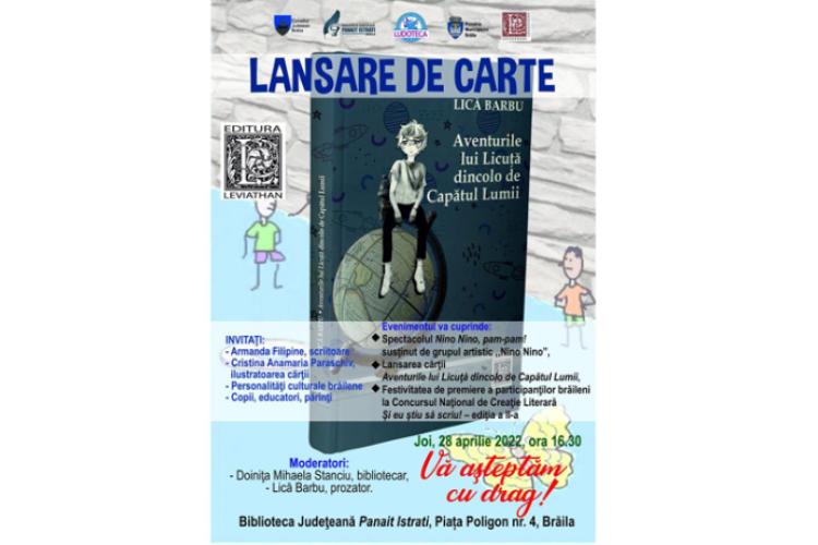 Biblioteca Județeană „Panait Istrati” Brăila organizează joi, 28 aprilie, la ora 16.30, lansarea cărții „Aventurile lui Licuță dincolo de Capătul Lumii”, autor Lică Barbu. Evenimentul cuprinde un moment artistic susținut de grupul „Nino-Nino”, copiii pe care autorul îi coordonează în cadrul Ludotecii de trei ani, derulând împreună cu cei mici programe variate de muzică, teatru și umor. Cu acest prilej, are loc și festivitatea de premiere a elevilor participanți din Brăila la Concursul Național de Creație literară ”Și eu știu să scriu!”.