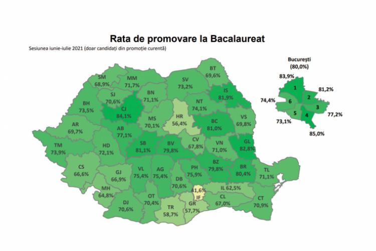 rata cumulată de promovare (înainte de contestații) este de 67,8%, în creștere cu aproape 5% față de anul trecut: 62,9%). Pentru promoția curentă, rata de promovare este 73,9% (un plus de 2,5%, comparativ cu aceeași etapă din sesiunea iunie-iulie 2020: 71,4%), iar pentru promoțiile anterioare, 27,6% (o majorare de 2,6%, comparativ cu sesiunea iunie-iulie 2020: 25%).