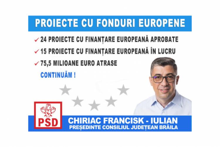 Candidatul PSD pentru preşedinţia Consiliului Judeţean Brăila, Francisk Chiriac, s-a înscris în “Bătălia pe proiecte” cu un al treilea proiect, parte din planul său general intitulat “Pentru Brăila tuturor”. De această dată, Chiriac a vorbit despre realizările prin fonduri europene şi proiectele pe care le are în plan pentru următorul exerciţiu financiar.