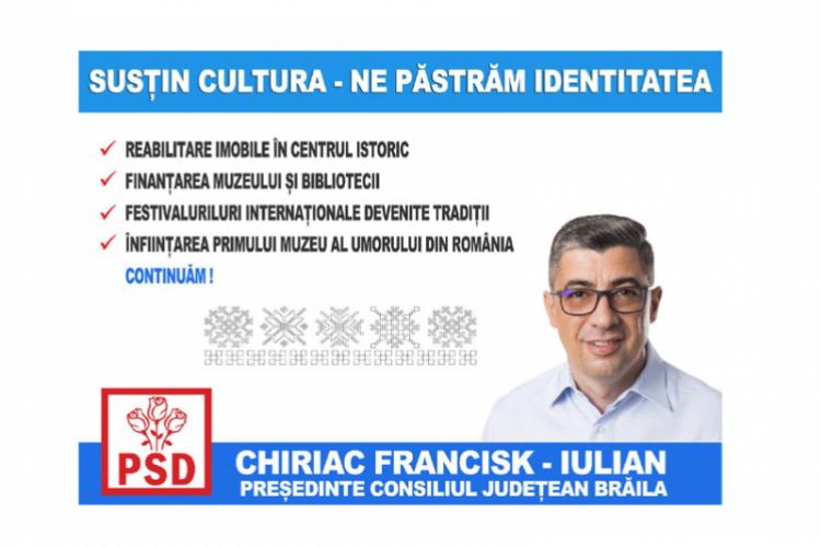 Candidatul PSD Brăila pentru conducerea Consiliului Judeţean, Francisk Chiriac, s-a înscris în “Bătălia pe proiecte” cu un ultim punct – susţinerea activităţilor culturale. Şi acest proiect face parte din planul general al PSD-istului pentru judeţ, intitulat “Pentru Brăila tuturor”. Chiriac a subliniat că are de gând să continue sprijinirea evenimentelor culturale care s-au desfăşurat şi în ultimii patru ani de mandat, a prezentat sumele alocate pentru susţinerea unor asociaţii culturale în această perioadă, adăugând şi un bilanţ al spectacolelor organizate cu ajutorul CJ. Totodată, social-democratul a vorbit şi despre câteva noutăţi pregătite în cazul în care va obţine un nou mandat.