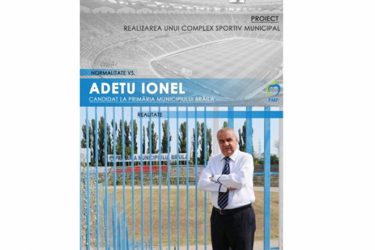 Ionel Adetu, candidat la funcţia de Primar al Municipiului Brăila din partea Partidului Mişcarea Populară (PMP) s-a înscris în campania “Bătălia pe proiecte” lansată de cotidianul “Obiectiv”. În proiectul trimis, Ionel Adetu propune realizarea unui complex sportiv municipal în Parcul Monument, pe locul vechiului stadion de fotbal, care va cuprinde: stadion de fotbal cu o capacitate de 12.000-14.000 de locuri, reabilitarea stadionului de atletism, modernizarea Sălii Polivalente, teren de baschet, teren de volei şi piste de bowling. Candidatul PMP Brăila la Primărie susţine că acesta este un proiect de suflet, care va încuraja practicarea sportului de performanţă, va atrage turişti prin organizarea de competiţii de anvergură şi va reanima viaţa sportivă şi culturală a Brăilei. Costurile implementării acestui proiect se ridică la 25-30 de milioane de euro, iar sursa de finanţare identificată de Adetu sunt fondurile ce pot fi obţinute de la Compania Naţională de Investiţii.