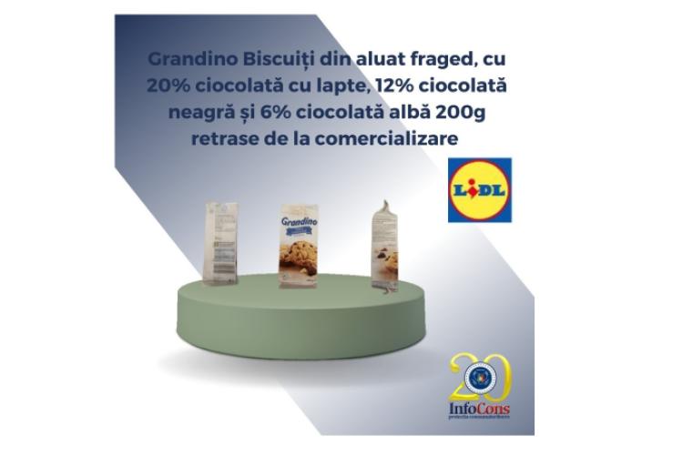 * anunțul a fost făcut de InfoCons, care citează un comunicat al lanțului de magazine * potrivit comunicatului Lidl, produsul „Grandino Biscuiți din aluat fraged, cu 20% ciocolată cu lapte, 12% ciocolată neagră și 6% ciocolată albă 200g” poate să conțină corpuri străine metalice, reprezentând un real pericol de rănire * produsul poate fi returnat în toate magazinele Lidl, iar contravaloarea acestuia va fi restituită, fără a fi necesară prezentarea bonului fiscal