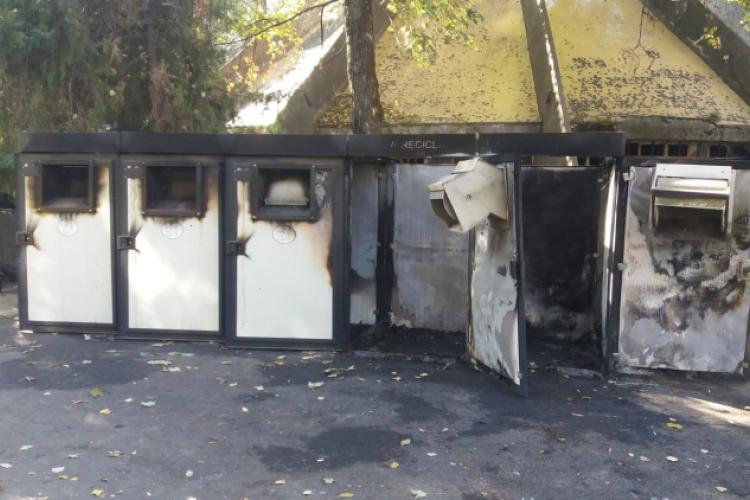 STIRE INITIALA: Alt modul de colectare selectivă distrus prin incendiere. Suspectul, un “boschetar” supărat că nu mai poate aduna PET-uri