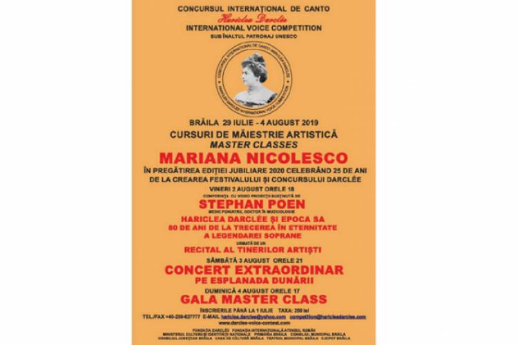 Cursurile de Măiestrie Artistică oferite de soprana Mariana Nicolesco, în contextul Festivalului şi Concursului Internaţional de Canto Hariclea Darclée, manifestări aşezate sub Înaltul Patronaj UNESCO, începute la Brăila pe 29 iulie, continuă. Conferinţa susţinută vineri, 2 august, de Stephan Poen, Medic Foniatru, Doctor în Muzicologie, o va situa în epoca sa pe Hariclea Darclée, artista adorată de public şi venerată de compozitori, prima soprană a lumii timp de peste două decenii. Conferinţa va fi punctată de proiecţii video cu arii în care a triumfat Mariana Nicolesco, arii din opere interpretate cândva şi de Darclée: I Pagliacci de Leoncavallo, Mefistofele de Boito, Carmen de Bizet, Aida de Verdi, Tosca de Puccini. Serata se va încheia cu un Recital al tinerilor artişti cuprinzând pagini din vastul repertoriu al Haricleei Darclée.