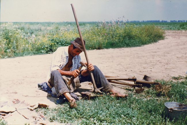 Fotografia e făcută în vara anului 1997, pe un câmp de pe vatra fostului sat Budişteanu, zona comunei Bordei Verde. Un bărbat căruia pălăria de pâslă, cămaşa albă în carouri şi tălpile goale îi dădeau un aer pitoresc, de ţăran autentic, bătea fierul sapei pe o mică nicovală, pentru a putea prăşi mai cu spor tarlaua cu porumb. Astfel de scene erau obişnuite în acea perioadă, când multe familii din satele brăilene îşi lucrau individual pământul pe care îl recuperaseră de la fostele Cooperative Agricole de Producţie (CAP) din vremea regimului comunist. Mai mult ca sigur, încă mai există şi acum săteni care îşi prăşesc singuri porumbul sau îşi ară tarlalele cu plugul tras de cai, însă, în foarte mare măsură, ţăranii brăileni şi-au dat terenurile în arendă, iar utilajele agricole performante îşi fac din ce în ce mai mult simţită prezenţa pe câmpurile brăilene.