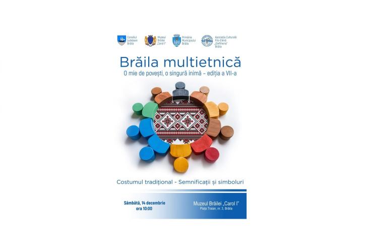 Sâmbătă, 14 decembrie, de la ora 10:00, la sediul central al Muzeului Brăilei „Carol I”, din Piața Traian nr. 3, va avea loc un eveniment deosebit de interesant, marca Asociația Culturală Filo-Elenă „Eleftheria” Brăila, așteptat de toate etniile brăilene și nu numai: „Brăila multietnică. O mie de povești, o singură inimă” – ediția a VII-a. Ediția de anul acesta, dedicată Zilei Minorităților Naționale, are ca temă: „Costumul tradițional – semnificații și simboluri”.