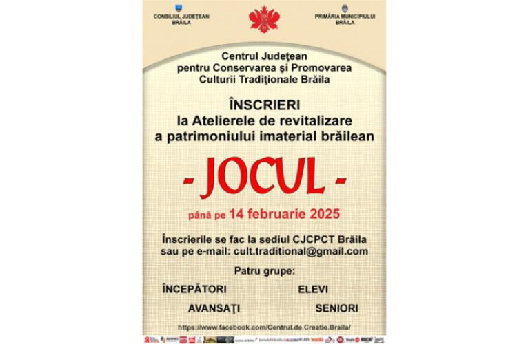 Este vorba de Atelierele de revitalizare a patrimoniul imaterial „Jocul”, Atelierul „Mens sana in corpore sano”, Atelierul Mâinilor Iscusite, Corala Camerata, Atelierul coral pentru copii „Vox et versus”, Atelierul de inițiere în arta dansului – Tango, Grupul vocal „Dunărencele” și, nu în ultimul rând, Atelierul de teatru pentru amatori. Toți cei interesați se pot înscrie la unul dintre atelierele organizate de instituție atât online, pe adresa cult.traditional@gmail.com, cât și direct la sediul Centrului Judetean pentru Conservarea si Promovarea Culturii Traditionale Brăila, din Piața Traian nr. 2. Termenul limită pentru înscrieri este 14 februarie. Potrivit organizatorilor, atelierele sunt gratuite și se adresează tuturor membrilor comunității.