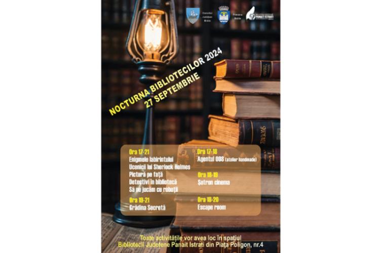 Vineri, 27 septembrie, începând cu ora 17.00, brăilenii sunt așteptați la Nocturna Bibliotecilor, pentru a sărbători, împreună cu bibliotecarii, bucuria lecturii și a imaginației. Cea de a XV-a ediție a Nocturnei Bibliotecilor are ca temă „Noaptea Detectivilor de Carte”, iar la eveniment sunt invitați să participe cititorii de toate vârstele.