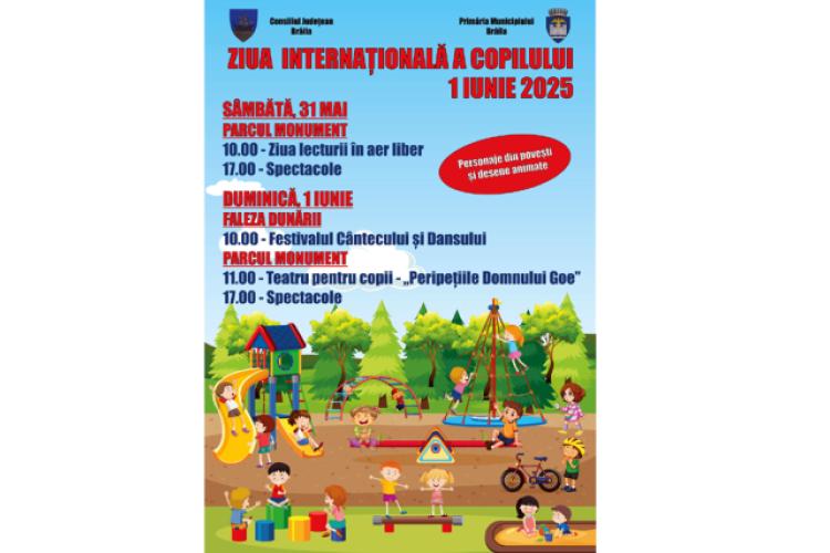 • Primăria Municipiului Brăila și Consiliul Județean Brăila organizează, în acest week-end, o serie de activități dedicate Zilei Internaționale a Copilului, desfășurate în Parcul Monument și pe Faleza Dunării • evenimentele includ spectacole, teatru, lectură în aer liber și festivaluri de muzică și dans pentru cei mici