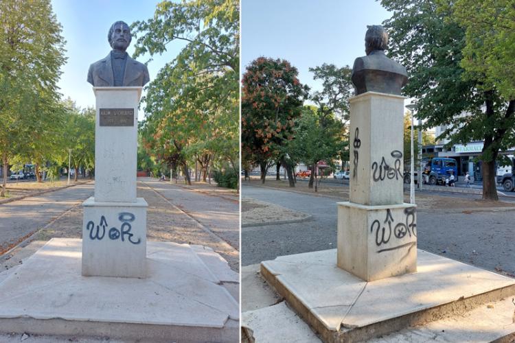 După ce, în vara anului trecut, indivizi certați cu legea – cărora le lipsesc și cei șapte ani de acasă – inscripționaseră trivialități pe soclul monumentului, anul acesta au batjocorit din nou opera de artă, profitând de faptul că bulevardul se află în ample lucrări de reabilitare și zona este aproape pustie în afara programului de lucru al constructorilor. De data aceasta, murdăria stil „grafitti” este și mai pronunțată și se întinde pe toate laturile soclului. Monumentul a fost ținta huliganilor și în urmă cu doi ani, a celor care își bat joc de istoria orașului și de banii cheltuiți pentru inaugurarea bustului de bronz al marelui om de cultură.