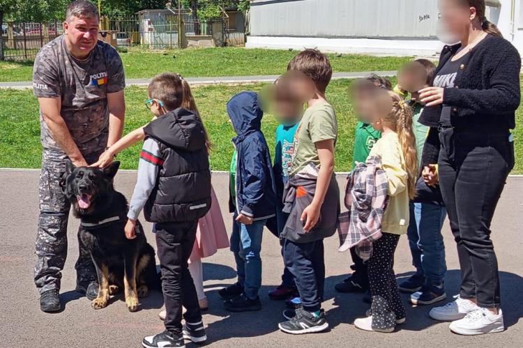 Prezent în mijlocul elevilor, Gipsy – câinele polițist – a fost copleșit cu mângâierile și aplauzele copiilor, fiind bucuros de misiunea încredințată.