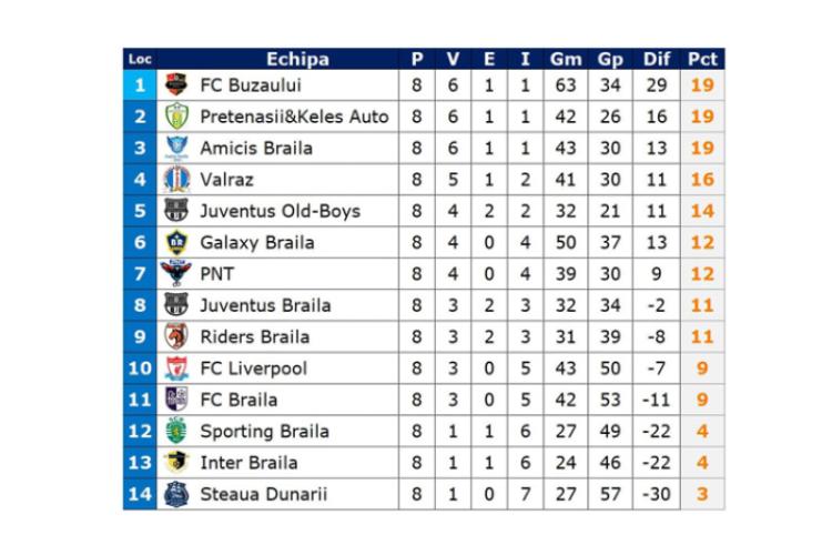 În etapa a 8-a a Campionatului de minifotbal Brăila, primele trei clasate au obținut victorii pe linie. Scorul rundei a fost stabilit de liderul campionatului, FC Buzăului, care s-a impus cu 9-4 în “duelul” cu penultima clasată, Inter Brăila. Formația de pe locul secund, Pretenașii & Keleș Auto, a câștigat tot la scor, 7-2, partida cu echipa de pe locul al 12-lea, Sporting. Doar ocupanta locului al treilea, Amicis, a trecut la limită, 3-2, de Juventus Old-Boys, locul al cincilea.