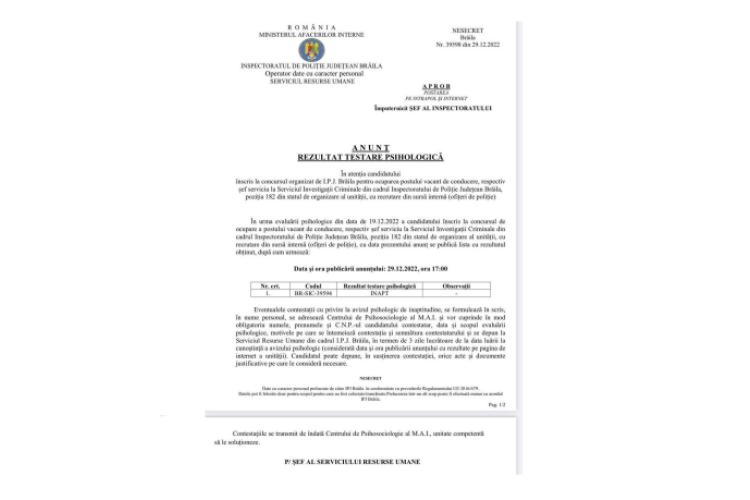 În comunicatul publicat pe site IPJ Brăila, la data de 29 decembrie, se arată că în urma evaluării psihologice din data de 19 decembrie, a candidatului înscris la concursul de ocupare a postului vacant de conducere la SIC, rezultatul a fost „INAPT”. Se poate formula contestaţie care se transmise la Centrul de Psihosociologie al MAI, unitate competentă să le soluţioneze.