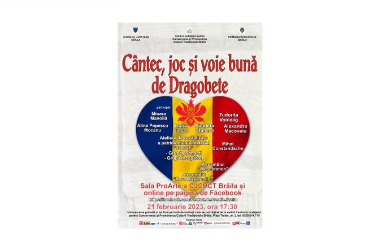 * evenimentul are loc marți, 21 februarie, în Sala ProArte a Centrului Județean pentru Conservarea și Promovarea Culturii Tradiționale Brăila * intrarea este liberă * participă interpreți de marcă ai ținutului Brăilei, precum și ansambluri folclorice consacrate – „Mușețeanca” și „Hora Măxinenilor”