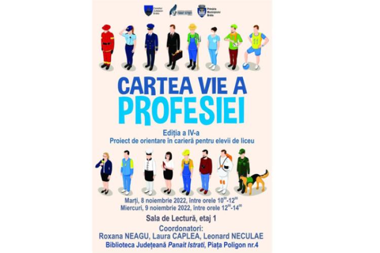 Biblioteca Județeană “Panait Istrati” Brăila dorește să ofere elevilor brăileni din clasele a XI-a și a XII-a o nouă viziune asupra profesiilor pentru care vor opta după terminarea studiilor și organizează, în perioada 8 – 9 noiembrie 2022, Proiectul ”Cartea vie a profesiei”, ajuns la a patra ediție.