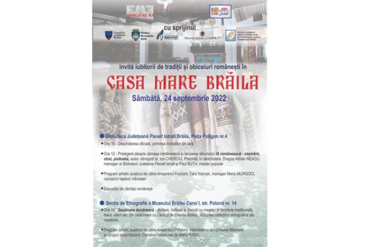 Sâmbătă, 24 septembrie, Biblioteca Județeană “Panait Istrati” la evenimentul “CASA MARE BRĂILA”, dedicat iubitorilor de tradiții. Alături de invitații sosiți din țară, brăilenii pot participa începând cu ora 12.00 la lansarea albumului „IA românească – veșmânt, strai, podoabă”, autor dr. Ion Cherciu, etnograf. Lansarea va fi prezentată de Dragoș Adrian Neagu, directorul Bibliotecii Județene și Paul Buța, meșter popular.