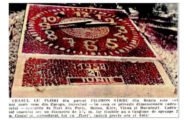 Entuziastul colecționar de fotografii de epocă Valerică Butoi, care postează frecvent pe rețelele sociale imagini cu Brăila de altădată, a publicat zilele trecute un extras din revista Flacăra – ediția iunie 1958 – cu o poză a Ceasului Floral din Grădina Mare, însoțită de o scurtă prezentare. Aflăm de acolo că, în 1958, parcul cunoscut în prezent cu denumirea Grădina Mare se numea, în urmă cu mai bine de 60 de ani, ”Filimon Sîrbu” și că ceasul floral era la vremea aceea ”cel mai mare din Europa, întrecând – în ceea ce privește dimensiunile cadranului – ceasurile cu flori din Paris, Berna, Kiev și București. Cadranul ceasului are un diametru de 5 metri și jumătate, iar limbile au o lungime de aproape 2 metri. Ceasul și … calendarul, tot cu flori, indică precis ora și data!”. Ce-i drept, după cum se poate vedea în acea fotografie, brăilenii chiar aveau de ce să fie mândri cu ceasul lor cu cadran din flori: cifrele bine definite și armonios poziționate erau o încântare pentru ochi, iar citirea orei era foarte ușor de făcut, atât din apropiere cât și de la mare distanță. În plus, era afișată și data completă: ziua, luna și anul.