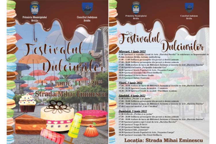 De 1 Iunie, Ziua Internațională a Copilului, Primăria Municipiului Brăila și Consiliul Județean Brăila dau startul celui mai “dulce” eveniment: Festivalul Dulciurilor. Anul acesta, evenimentul se întinde pe cinci zile, în perioada 1-5 iunie, timp în care brăilenii mici și mari sunt așteptați să se plimbe pe Strada Mihai Eminescu și să se oprească la căsuțele de lemn pentru a încerca bunătățile pregătite de comercianți.