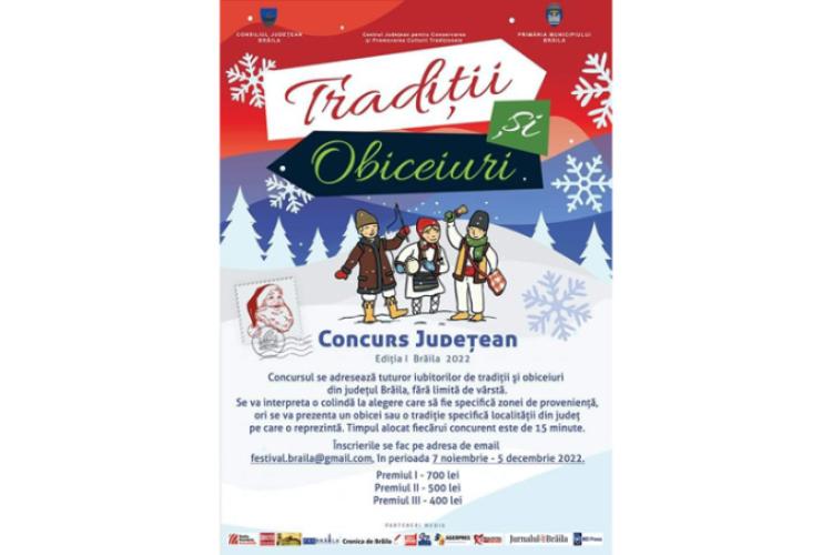 Consiliul Județean Brăila prin Centrul Județean pentru Conservarea și Promovarea Culturii Tradiționale Brăila și Primăria Municipiului Brăila organizează, în intervalul noiembrie-decembrie 2022, prima ediție a Concursului județean “Tradiții și obiceiuri”. Evenimentul are ca scop cunoașterea, conservarea și valorificarea tezaurului cultural, autentic brăilean, prin promovarea colindelor, a datinilor și obiceiurilor strămoșești din zona Brăila, prin păstrarea tradițiilor și a entității naționale, precum și implicarea comunității în perpetuarea actului cultural.
